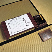 数種の香を聞き終わってその異同が判明すれば、ルールにしたがって「記紙」という小さな用紙に、銘々答えをしたためます。それを回収して、執筆が記録用紙に写し換え、正解と照合して採点します。